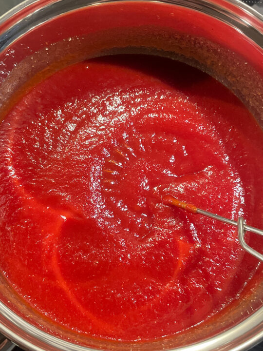 3. Simmer uncovered over low heat for 25 to 35 minutes, stirring regularly, until the texture resembles ketchup.