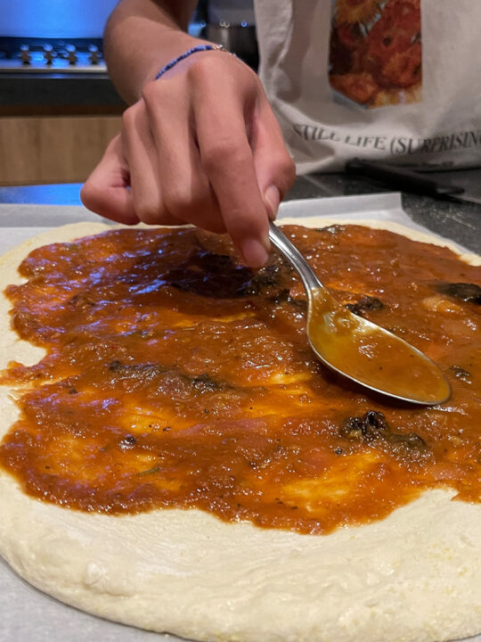 After the 4-6 hours have passed the dough should have doubled in size. Sprinkle some durum flour or all-purpose flour on top of them. Start with simple gestures bringing the middle part of the dough to the outside, once you have reached the size you would prefer, place on top tomato sauce and basil leaves, and mozzarella cheese along with a little bit of olive oil spread on top of the toppings.