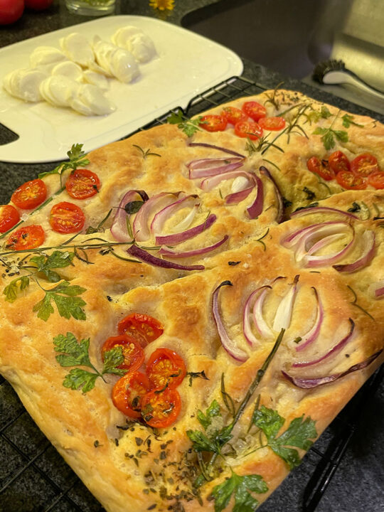 You can top with more olive oil when it’s come out of the oven if you wish for it to look burnished and glistening. If I’ve topped the focaccia with pesto or chimichurri I don’t tend to do this. With other toppings I do a little drizzle and it soaks right into the crust when it’s hot out of the oven.