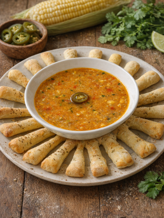 In a medium-sized saucepan over medium heat, add olive oil, then the onions. Saute for 3 to 4 minutes until translucent, stirring occationally. Add the garlic and jalapeno slices, bell pepper (save a little for decoration) and saute for another minute. Add corn kernels (save 100 g for last) and saute for another 3 minutes, stirring constantly. Add salt, pepper, vegetable stock and bring to a boil.